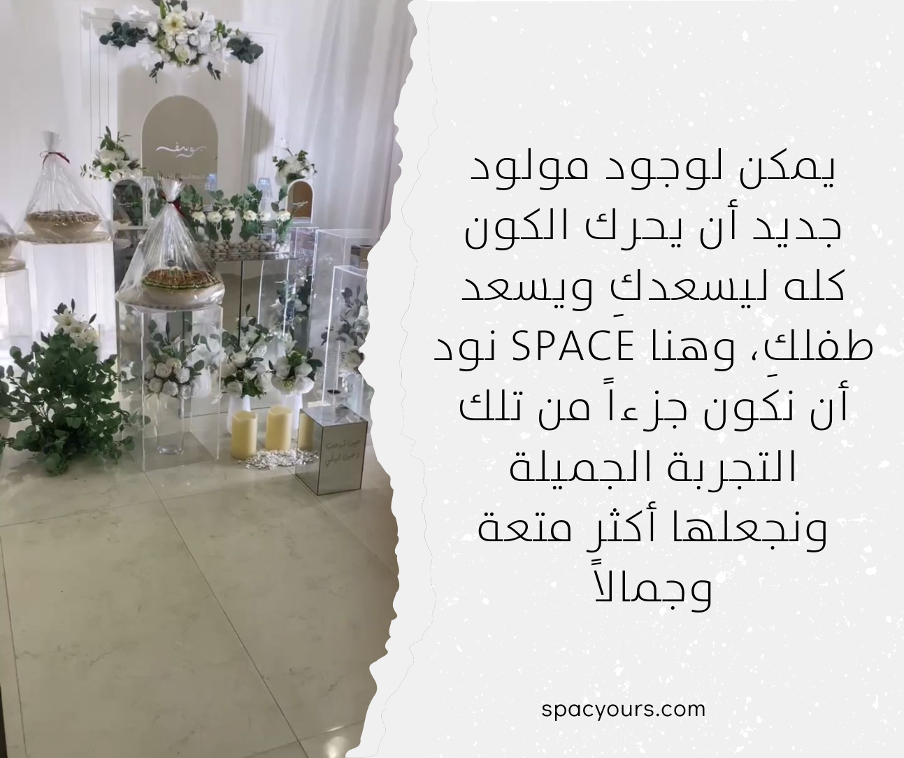 تعد خدمة SPACE لتأجير تجهيز استقبال مولود أو مولودة الحل الأمثل لتوفير الوقت والجهد على الآباء والأمهات في إعداد هذه المناسبةالخاصة. بغض النظر عن الأسلوب أو الحجم الذي تختاره، فإن خدمتنا تؤكد على تقديم الأفضل لكل عميل، وتقديم حفل استقبال بالمستوى المألوف الذي يريده الجميع.