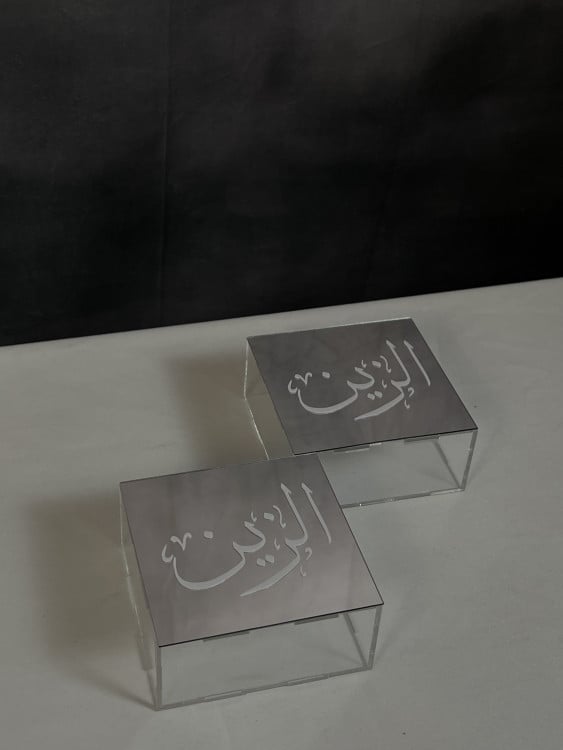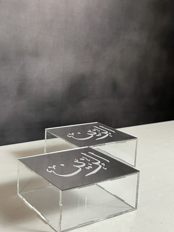 توزيعات بمقاس 10*10 وارتفاع 3 بعدد 12 حبة مع إمكانية كتابة الاسم بعدة خيارات 'نحت او ستيكر او اكريليك بارز' وكلها تأتي باللون الأبيض