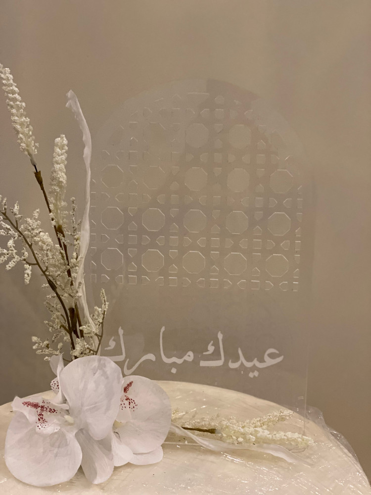 ستاند اكريليك شفاف بنقش العيد وعبارة 'عيدك مبارك' المصممة بأسلوب فريد وأنيق يلائم مناسبة عيد الفطر المبارك. ويمكن للعميل إضافة بعض الزهور الناعمة لإضفاء لمسة رومانسية ناعمة على التصميم.